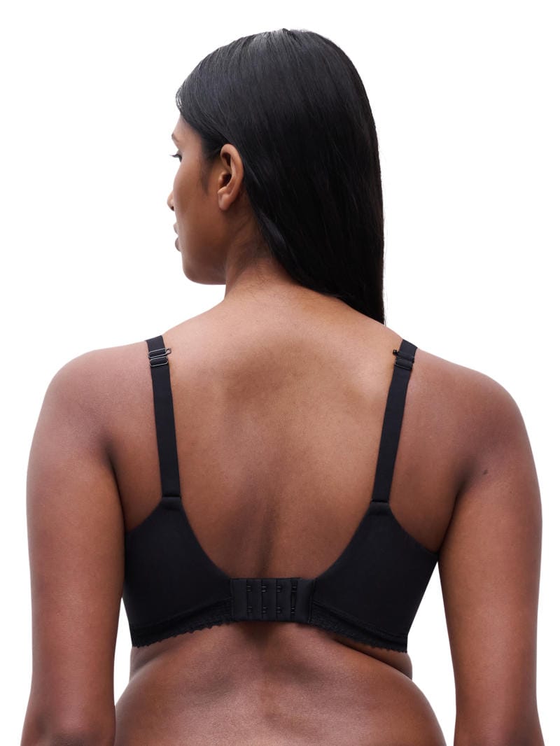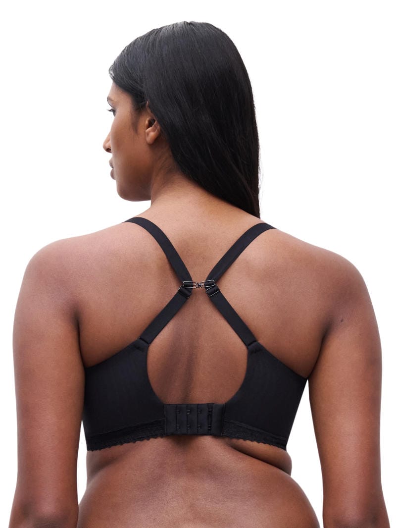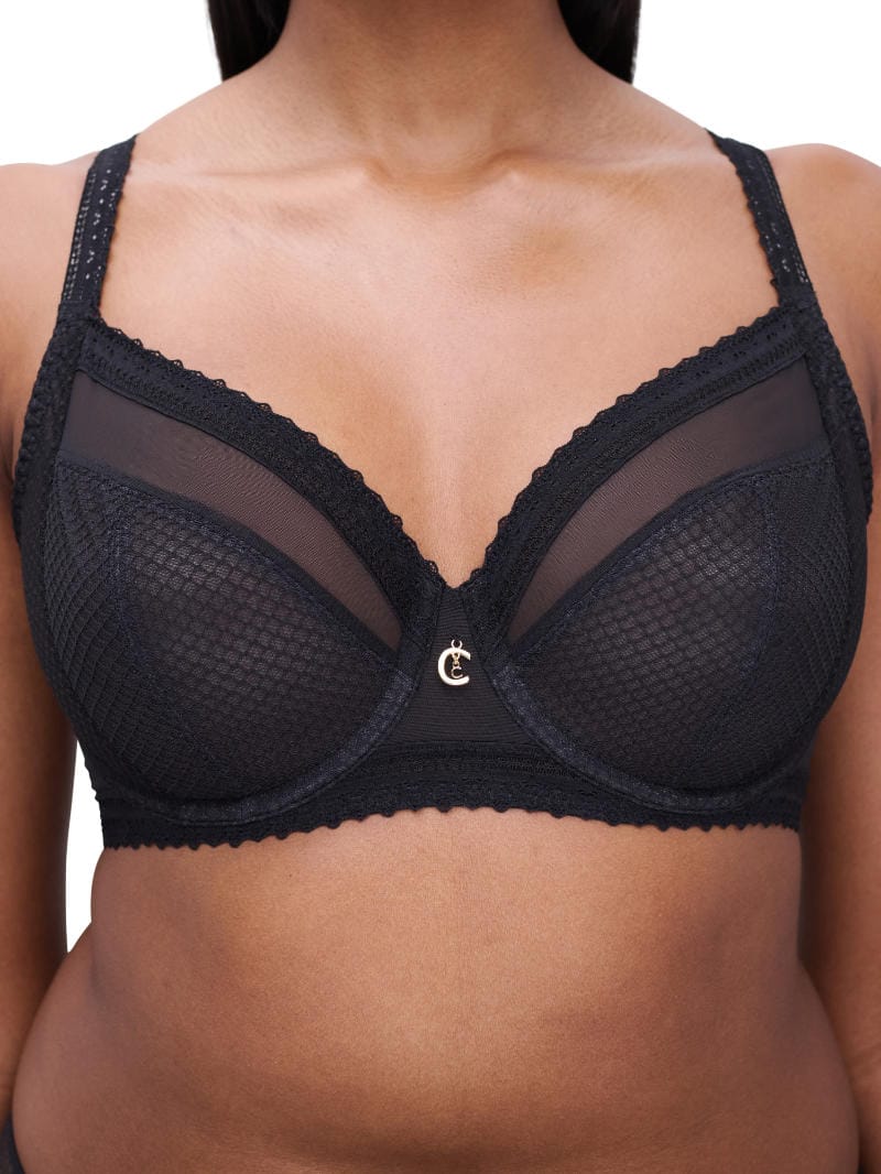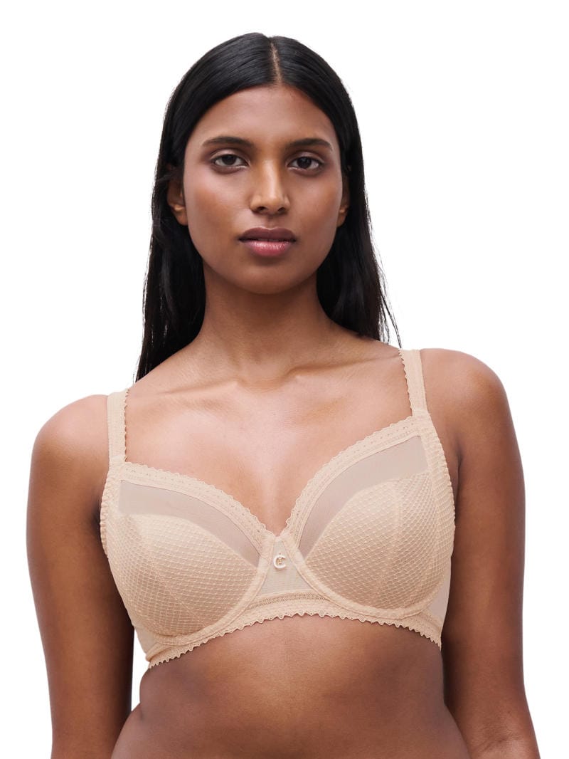 Romance Full Cup Underwired bra by Chantelle is a covering bra with side support, featuring a mix of lace and honeycomb mesh in the wings and trim, and a gold jewel at the centre front.