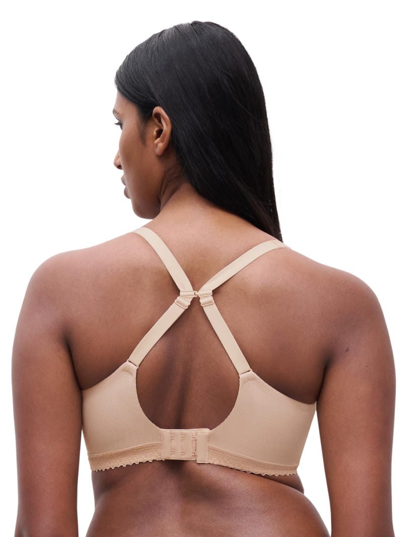 Description: Romance Full Cup Underwired bra by Chantelle is a covering bra with side support, featuring a mix of lace and honeycomb mesh in the wings and trim, and a gold jewel at the centre front.