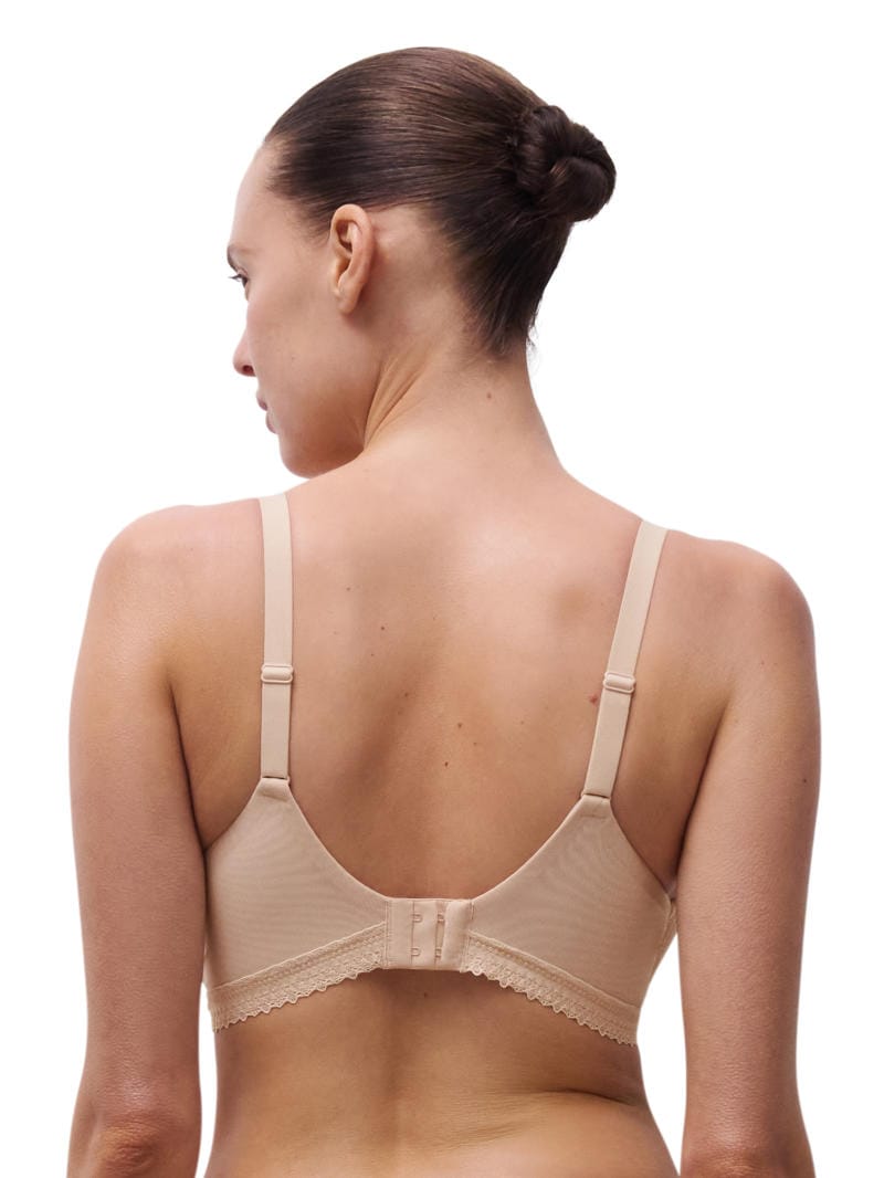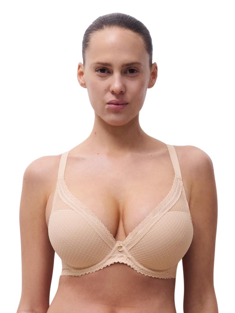 Description: Romance Plunge T-shirt bra by Chantelle is a padded cup bra, featuring a mix of lace and honeycomb mesh in the cup overlay, wings and trim, and a gold jewel at the centre front.