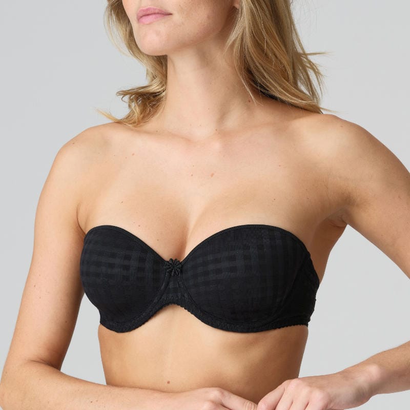Description: A strapless bra with a horizontal cup line. The straight back has a silicone strip to give extra support when the bra is worn strapless. It lifts without centring and gives more support, due to the high gore between the breasts.