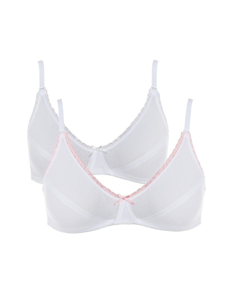 A two-pack of bras designed to be the very first bra for a daughter. Both bras are made of pure cotton and are soft and comfortable for a developing bust. One bra is plain white and the other is white with a pretty pink trim.